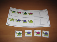 Turtle counting: Tip: To save on lamination (if you have a Xyron, and use sticky laminate instead of heat laminate) you can put 2 pages back to back and laminate. When you cut them apart the lamination is on the front, but not on the back, but who cares eh? You can download the turtle counting game here! If your looking for more than matching, you can have them write the numbers in the blank spaces too if you laminate!
